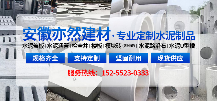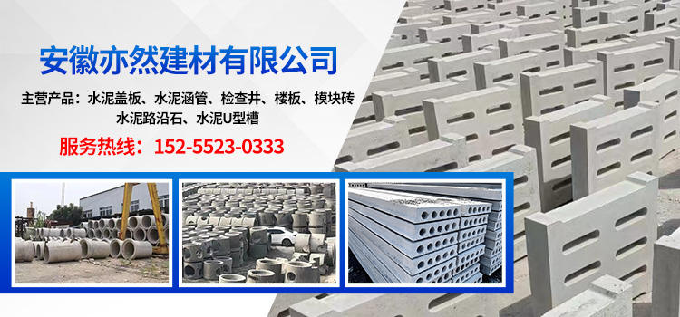 安徽亦然建材有限公司專業生產水泥涵管、水泥蓋板、檢查井、路沿石、水泥U型槽等各種水泥制品,公司技術先進,能設計、生產各種規格、型號的水泥制品,按需定制,滿足客戶需求,公司實力雄厚,加工設備齊全。